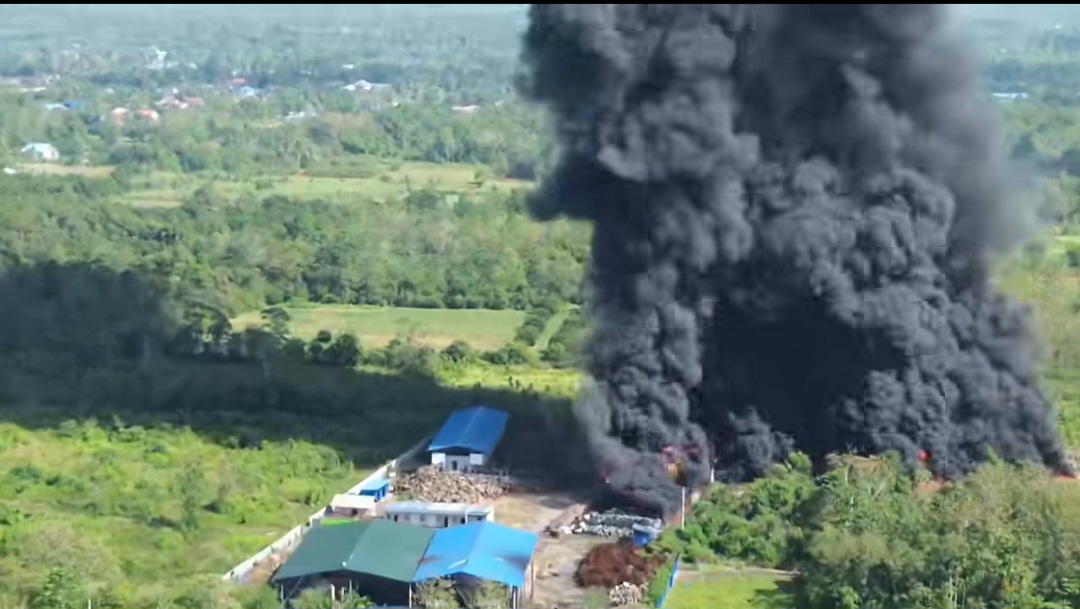Terlihat ada ratusan ban bekas di pabrik tersebut terbakar yang menyebabkan kepulan asap hitam tebal ke langit.
