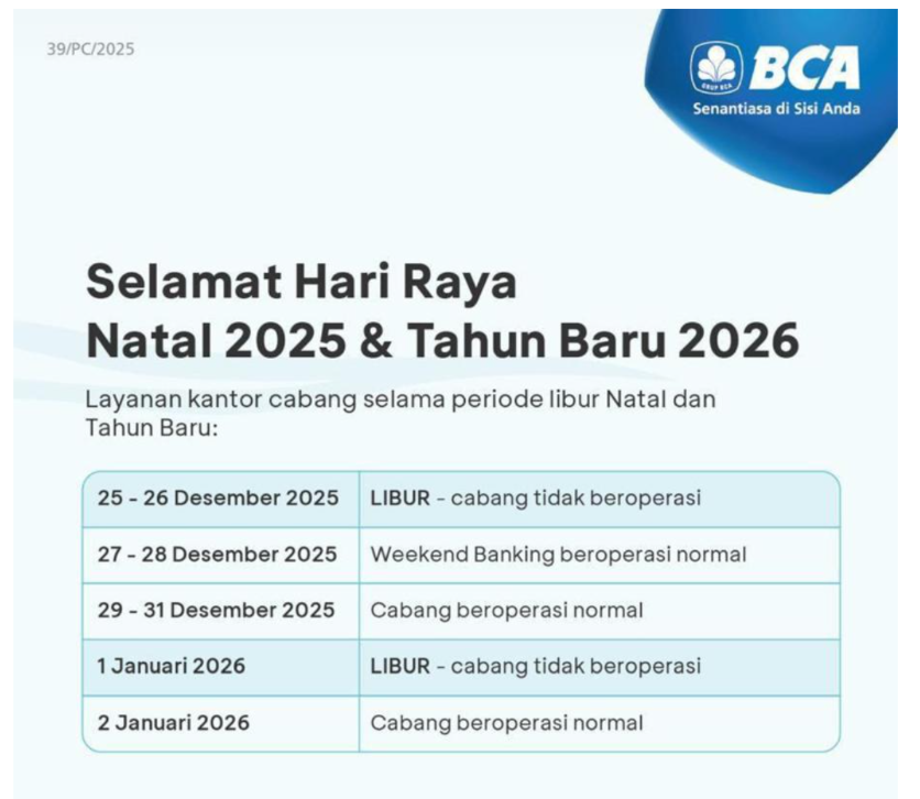 Berikut ini jadwal Operasional BCA Cabang Kendari Selama Libur dan Cuti Bersama Natal 2025 dan Tahun Baru 2026 :