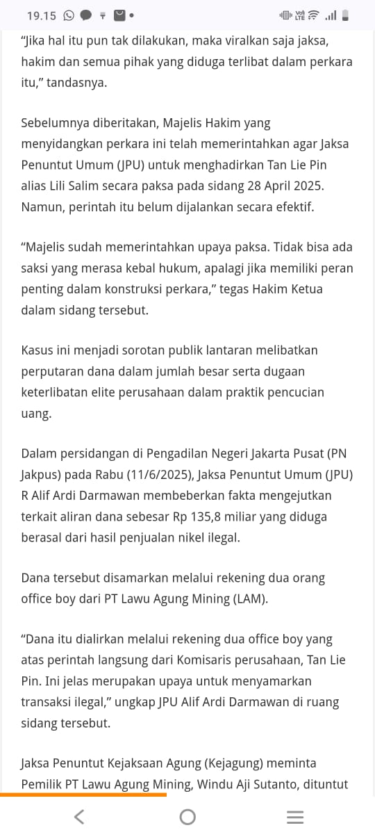 Salah satunya kami kutip pernyataan Hardius Karo Karo pada media Beritalima.com dengan judul “Skandal Korupsi Izin Tambang PT Antam, Nama Tan Lie Pin Mendadak Hilang dari Pusaran Perkara Pencucian Uang” dengan link berita berikut :