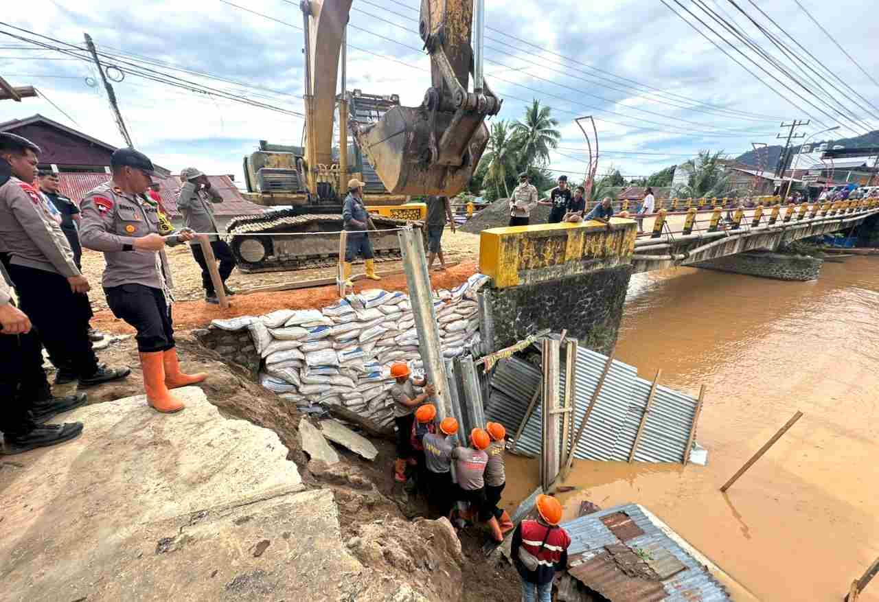Personel Brimob Bantu Perbaiki Jembatan yang Putus Akibat Banjir di Sumatera Utara