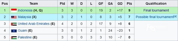 Tim asuhan Bima Sakti saat ini menempati puncak klasemen dengan hasil sempurna dari tiga pertandingan. Sedangkan Harimau Muda menempati posisi kedua dengan mengoleksi tujuh poin.
